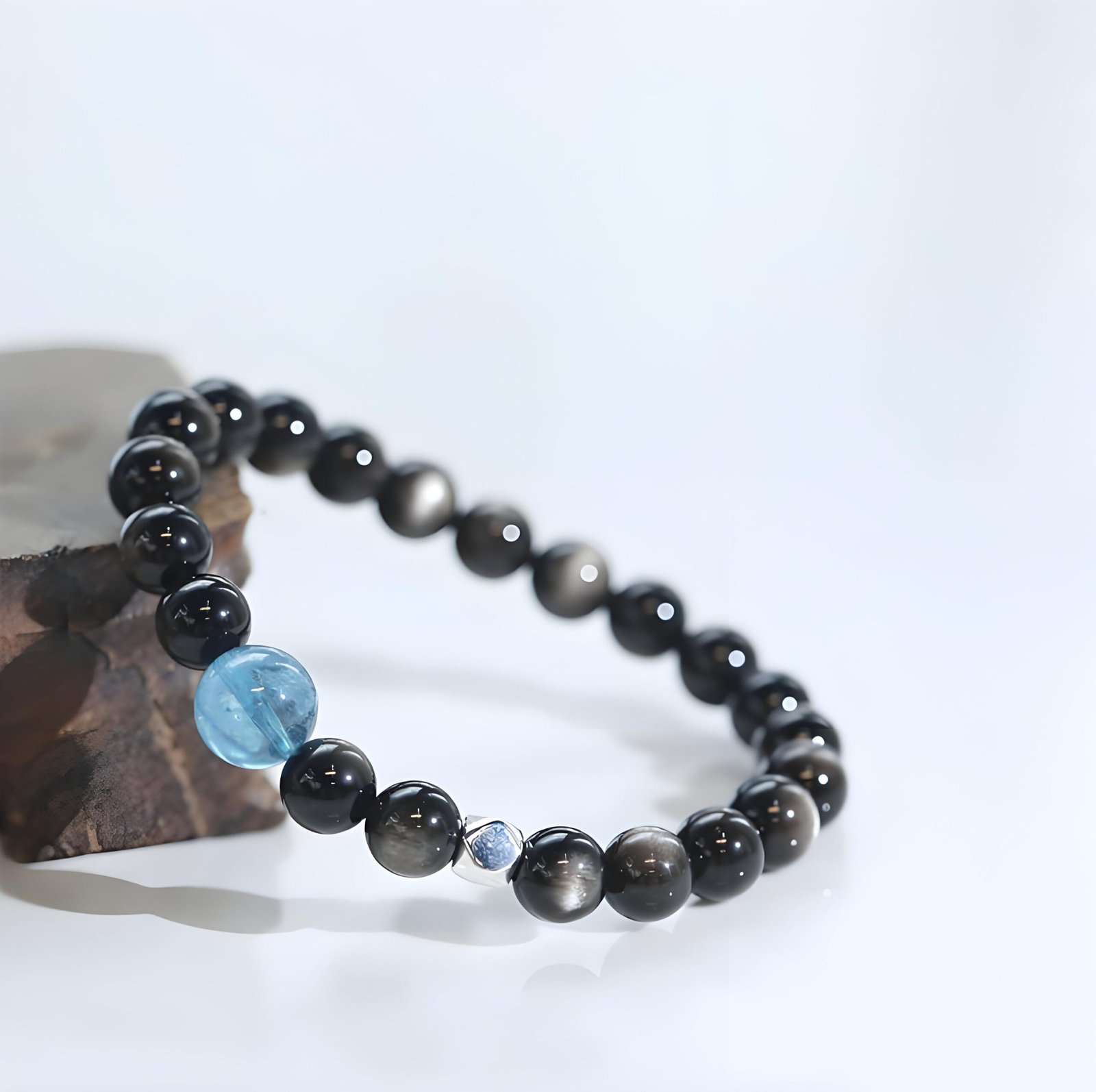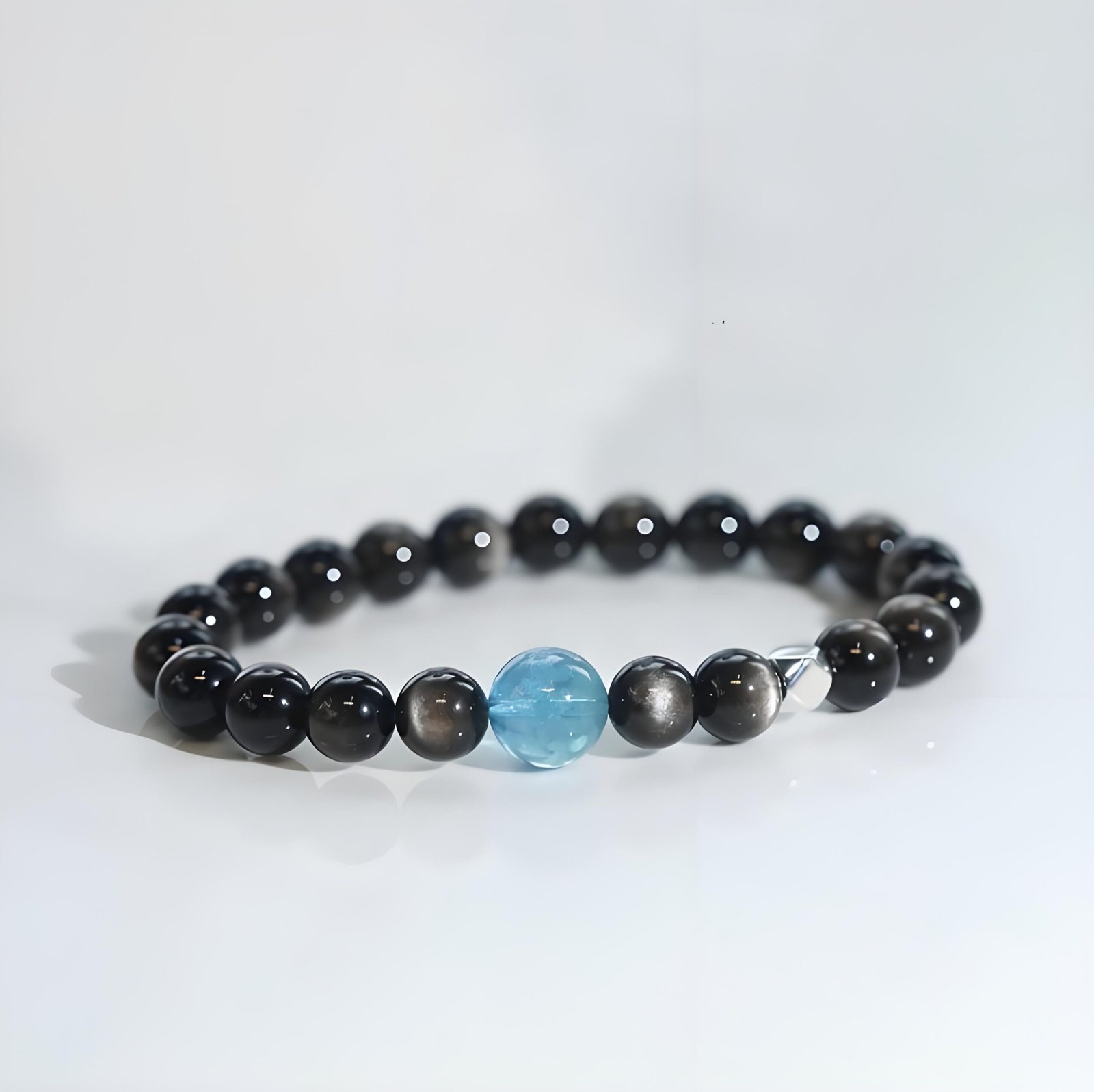 Obsidian bracelet (8mm, 17g) with aquamarine & 925 silver. Elegant, grounding, and protective—ideal for style and daily strength.
